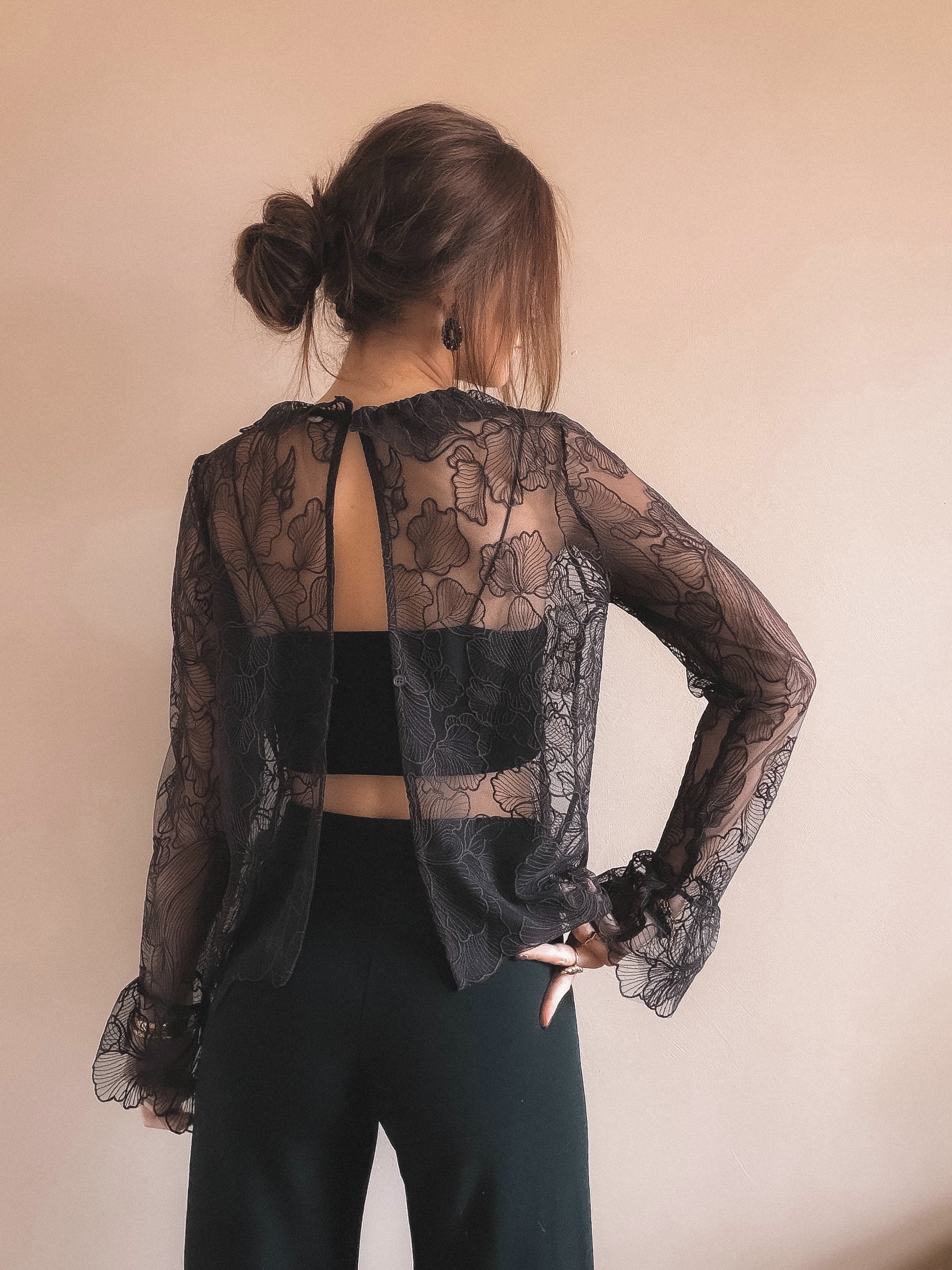 • Jeu de transparence délicat et dentelle florale qui révèle juste ce qu'il faut. Manches légères et dos subtilement ouvert (peu se fermer par un bouton également) à porter avec pantalon taille haute ou jupe