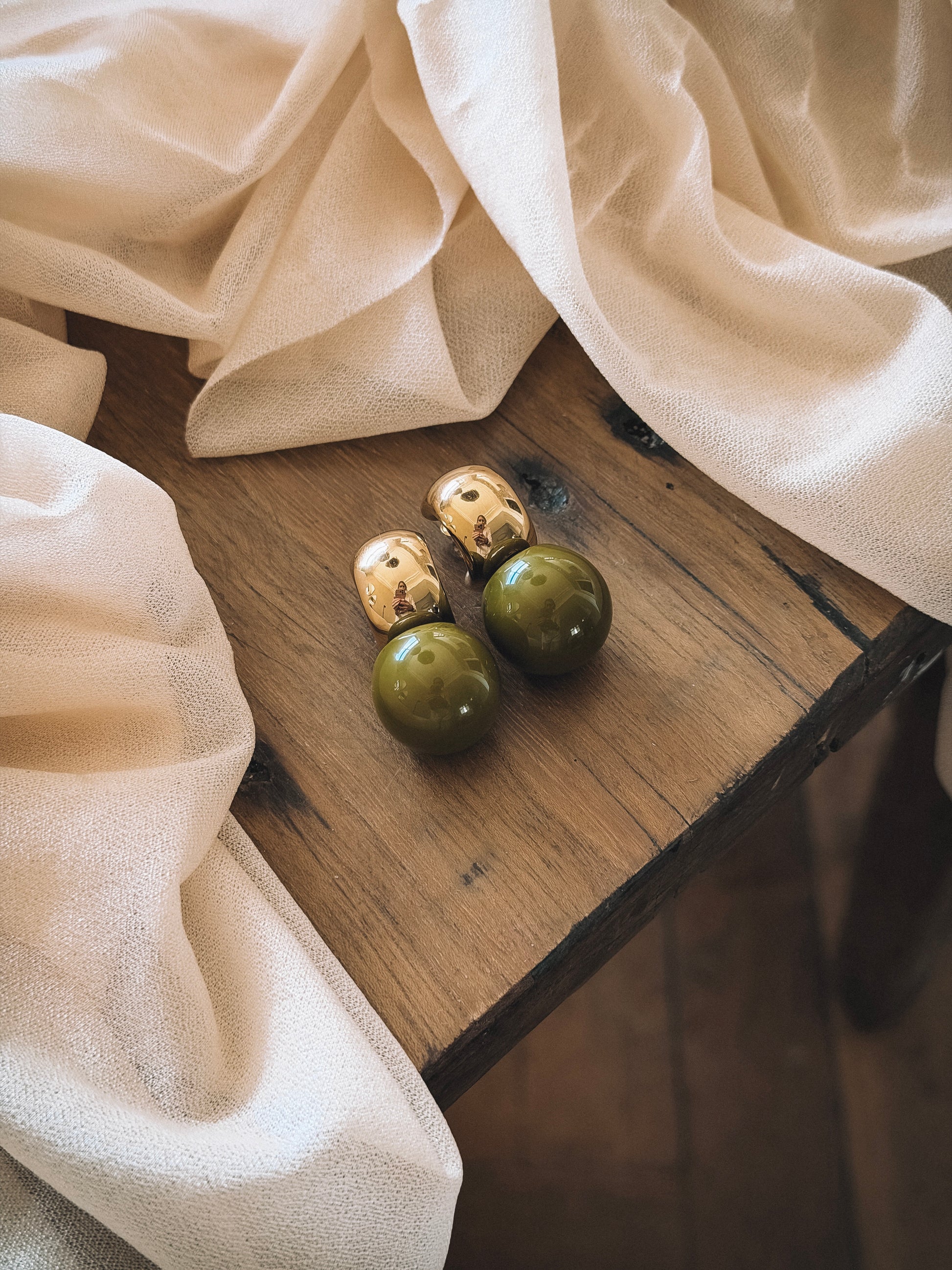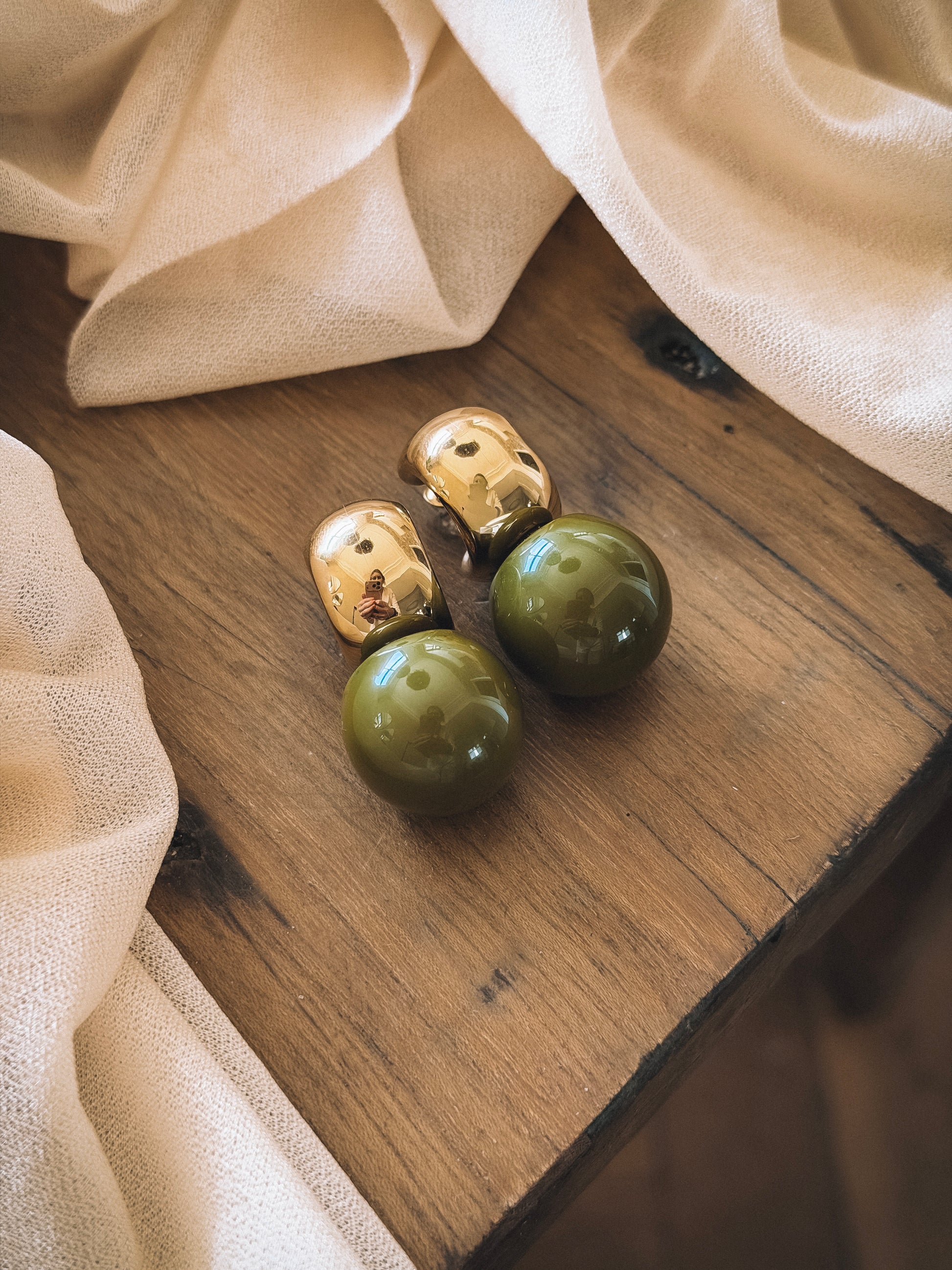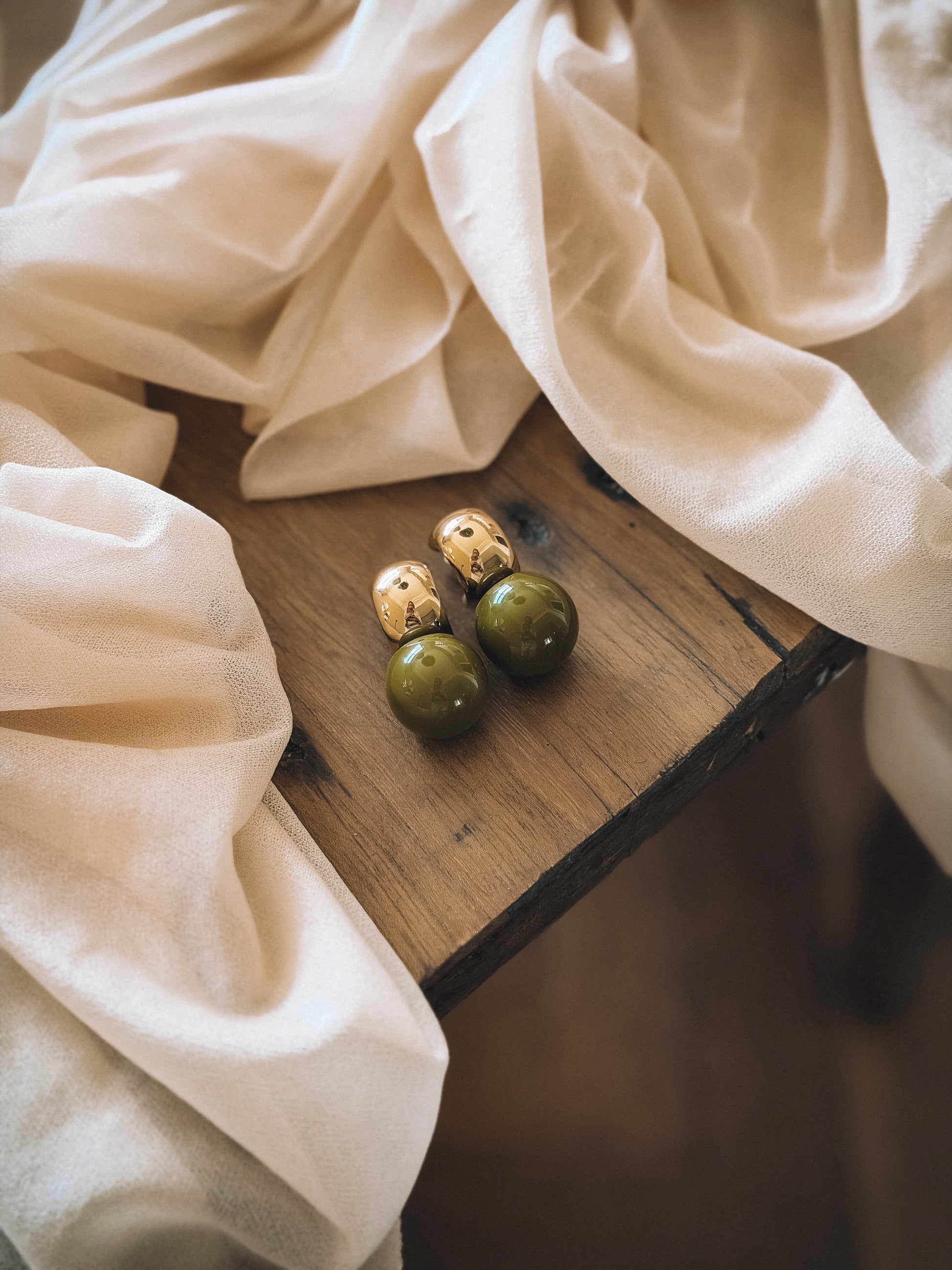 Couleur kaki, base doré associé a une perle sphérique vert olive une couleur profonde et élégante qui illumine le visage