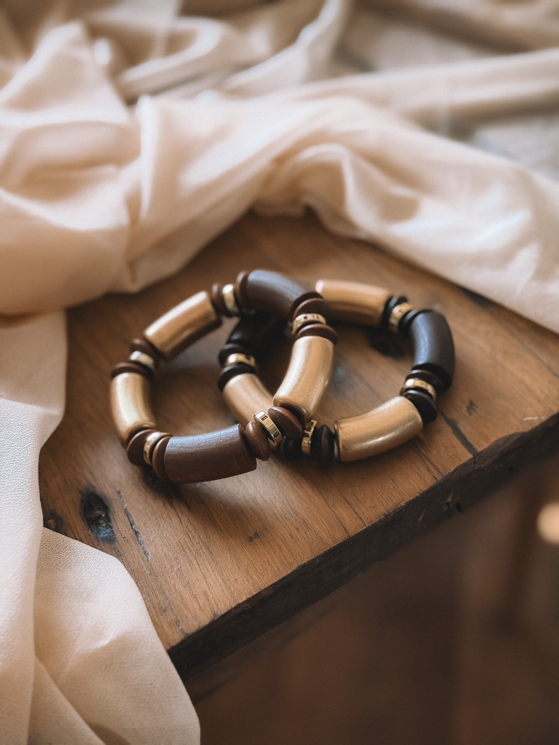• Bracelet en perles de bois aux nuances naturelles sublimés par des anneaux dorés