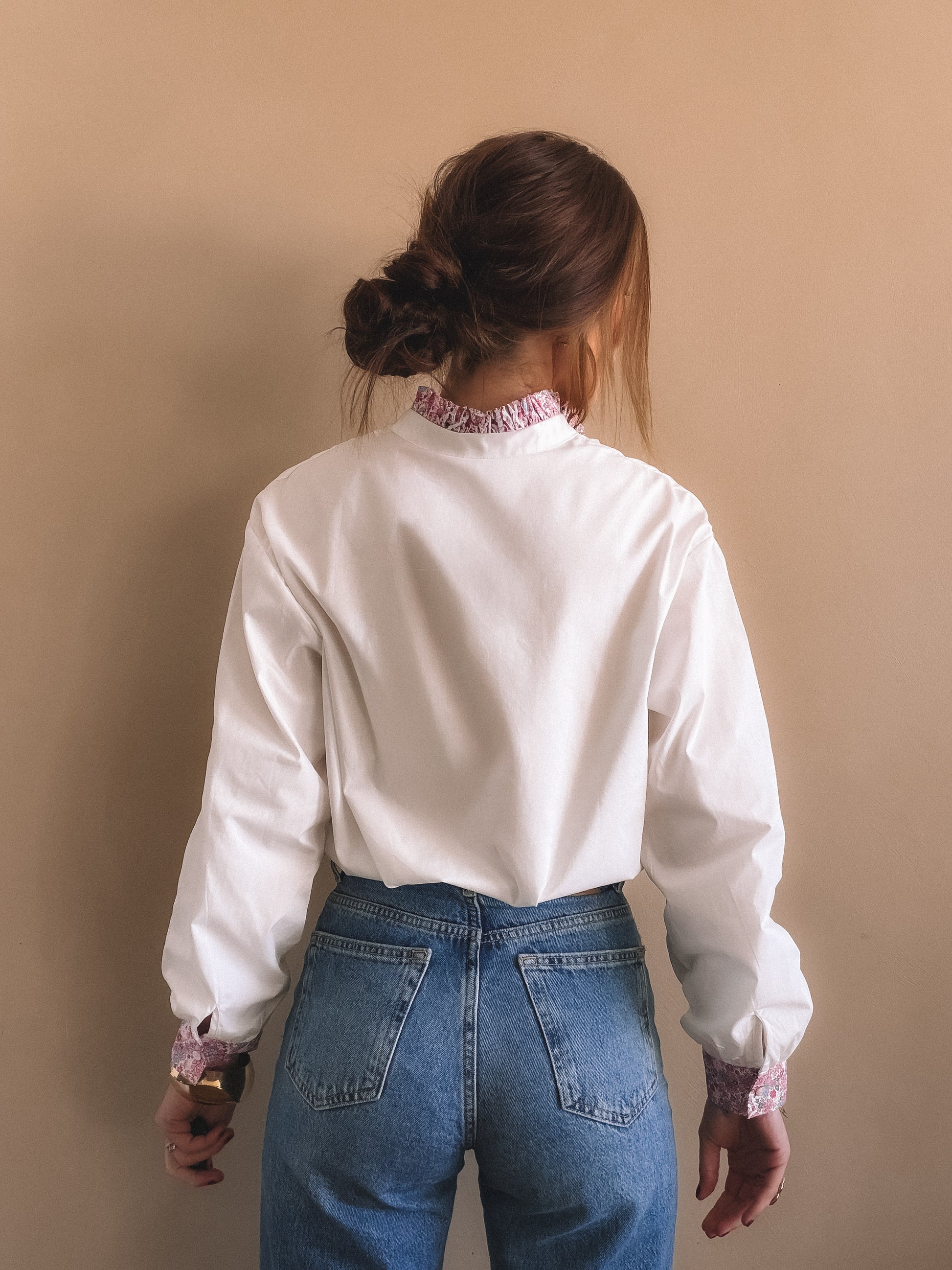 • Possède un joli col à volants et le long de la patte de boutonnage