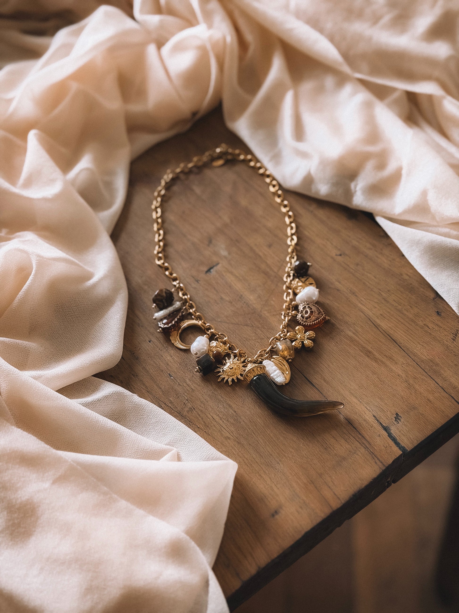 • Collier Nola mêle breloques dorées et perles aux reflets marron pour un rendu unique