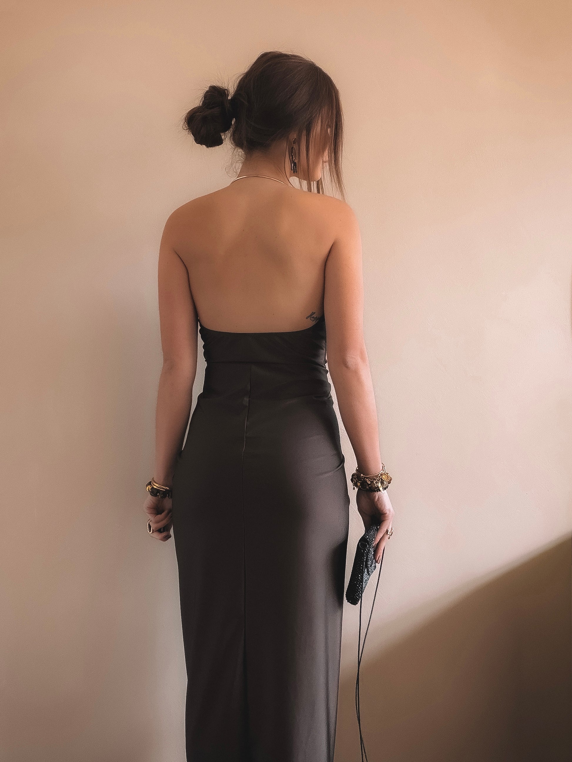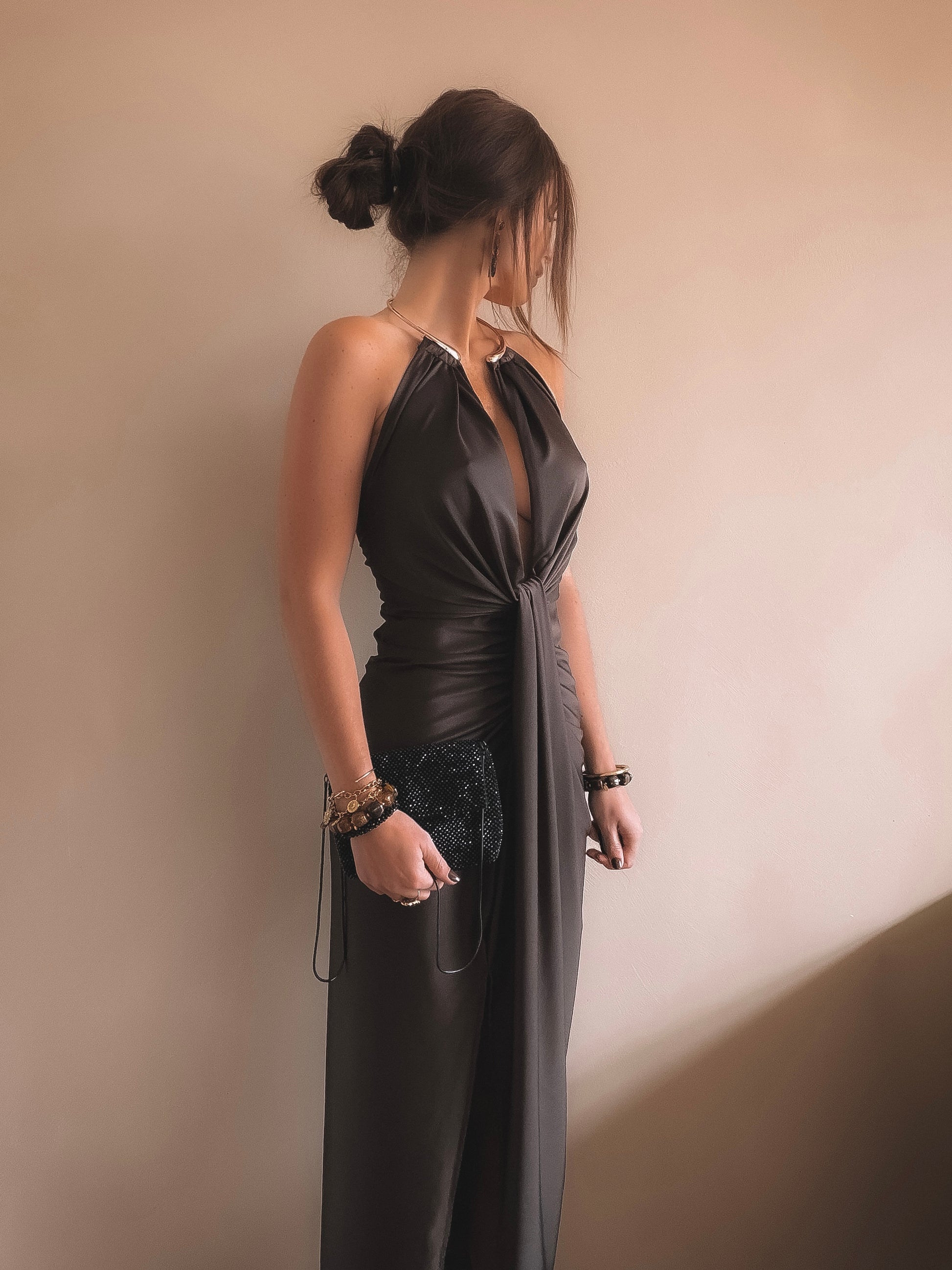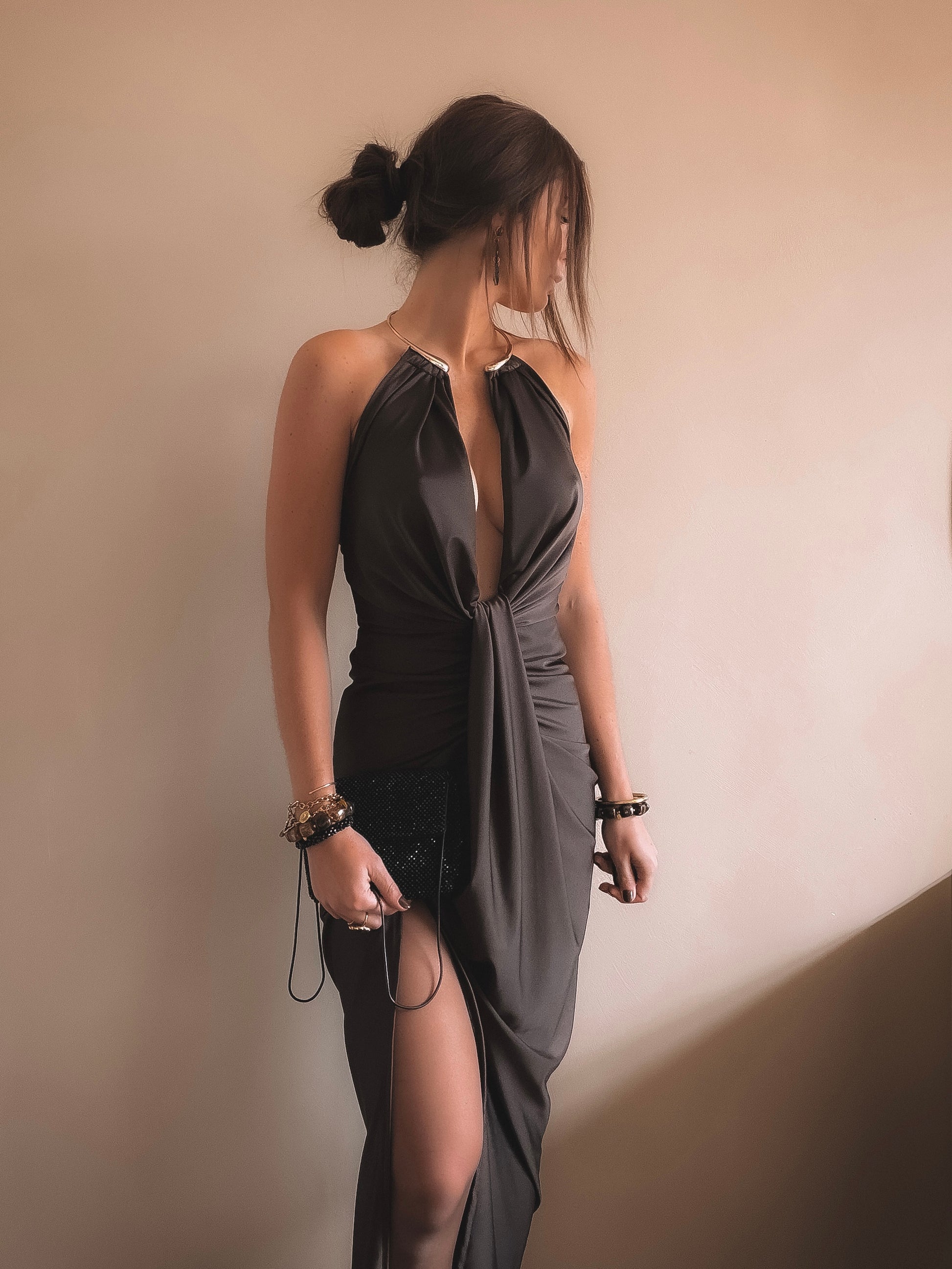 • Décolleté drapé ultra élégant? fente qui allonge la jambe, associé à son détail doré au niveau du cou qui en font la pièce parfaite pour briller en soirée. Fluide, chic et terriblement flatteur.