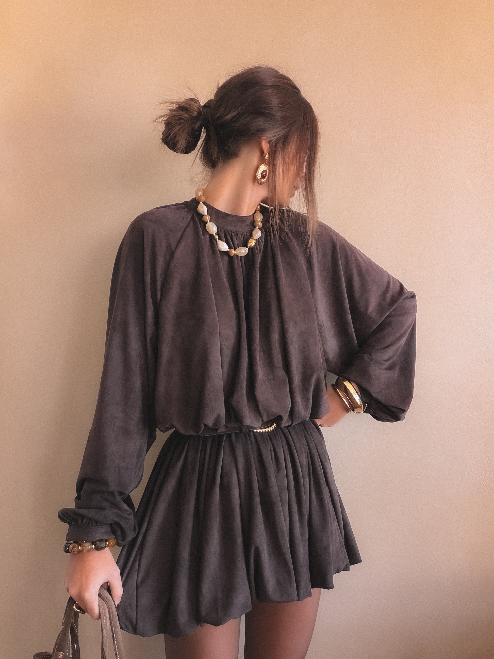 • Encolure ronde avec bouton et jupe bouffante avec la taille marquée