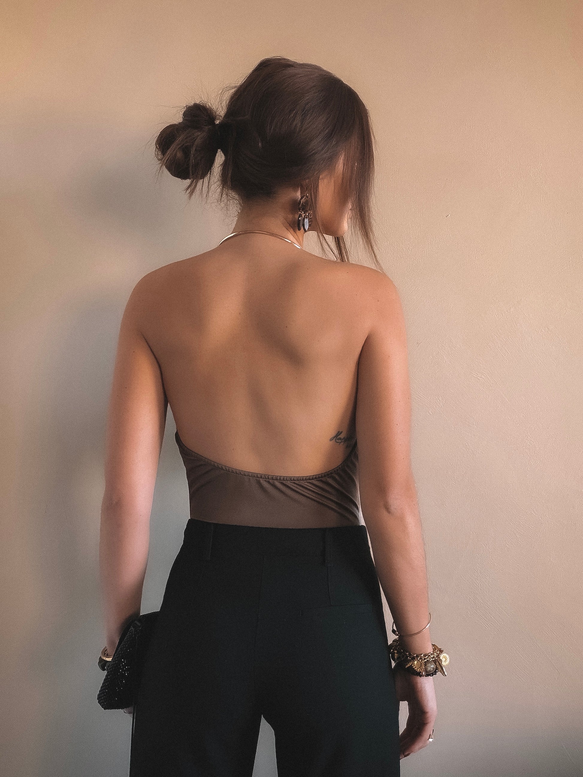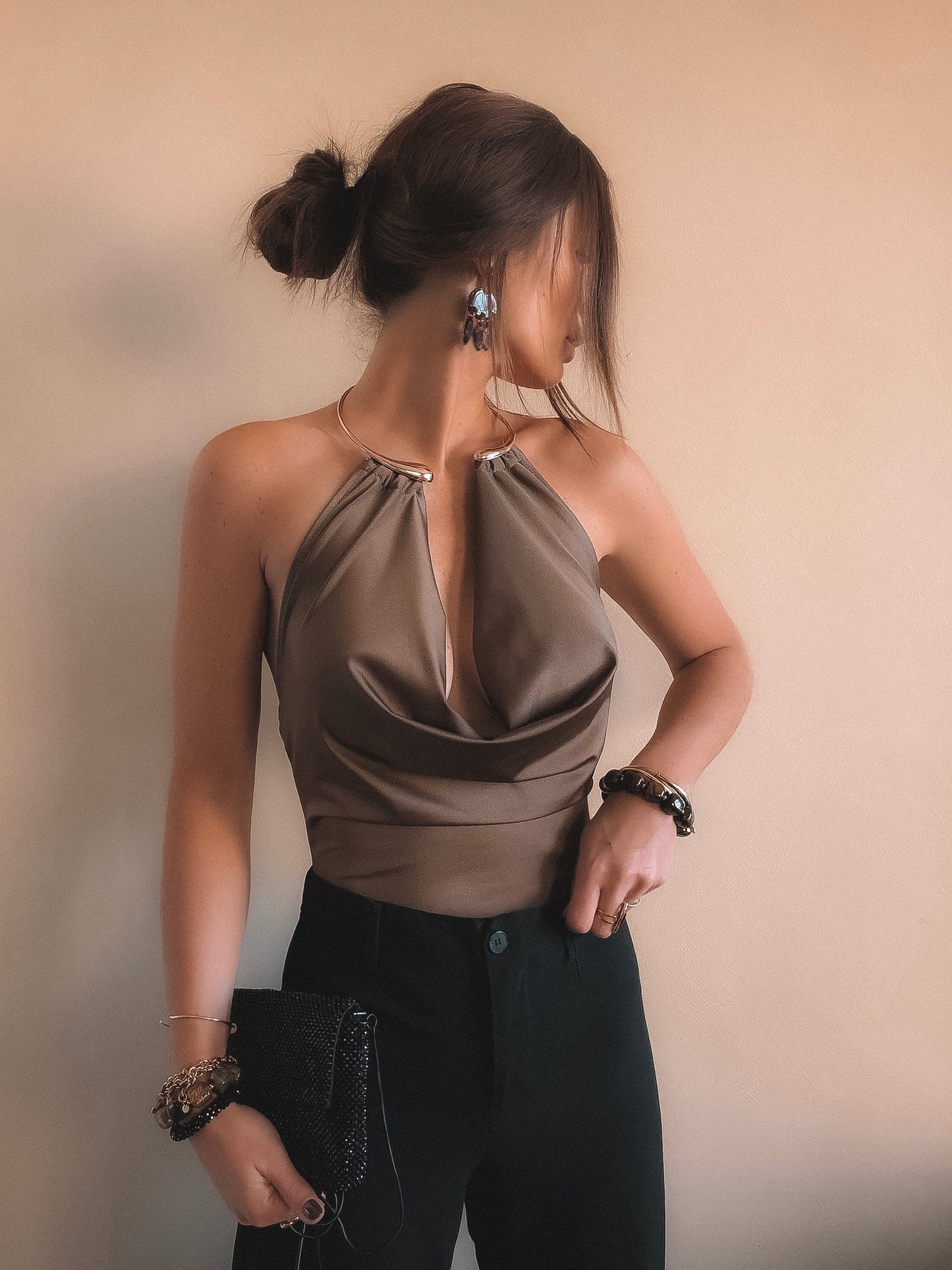 • Décolleté drapé ultra élégant associé à son détail doré au niveau du cou qui en font la pièce parfaite pour briller en soirée. Fluide, chic et terriblement flatteur.