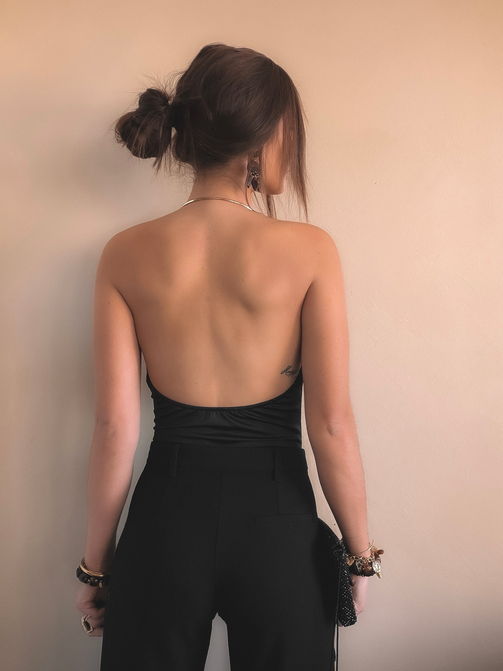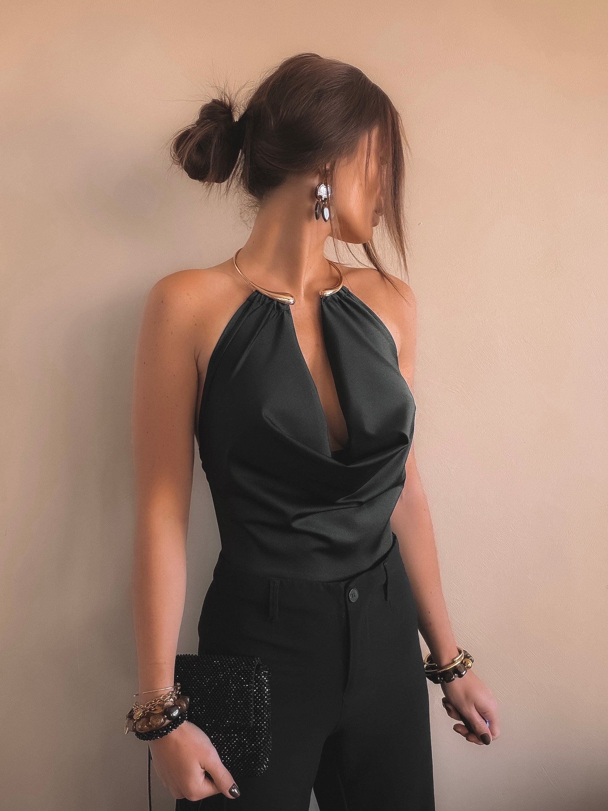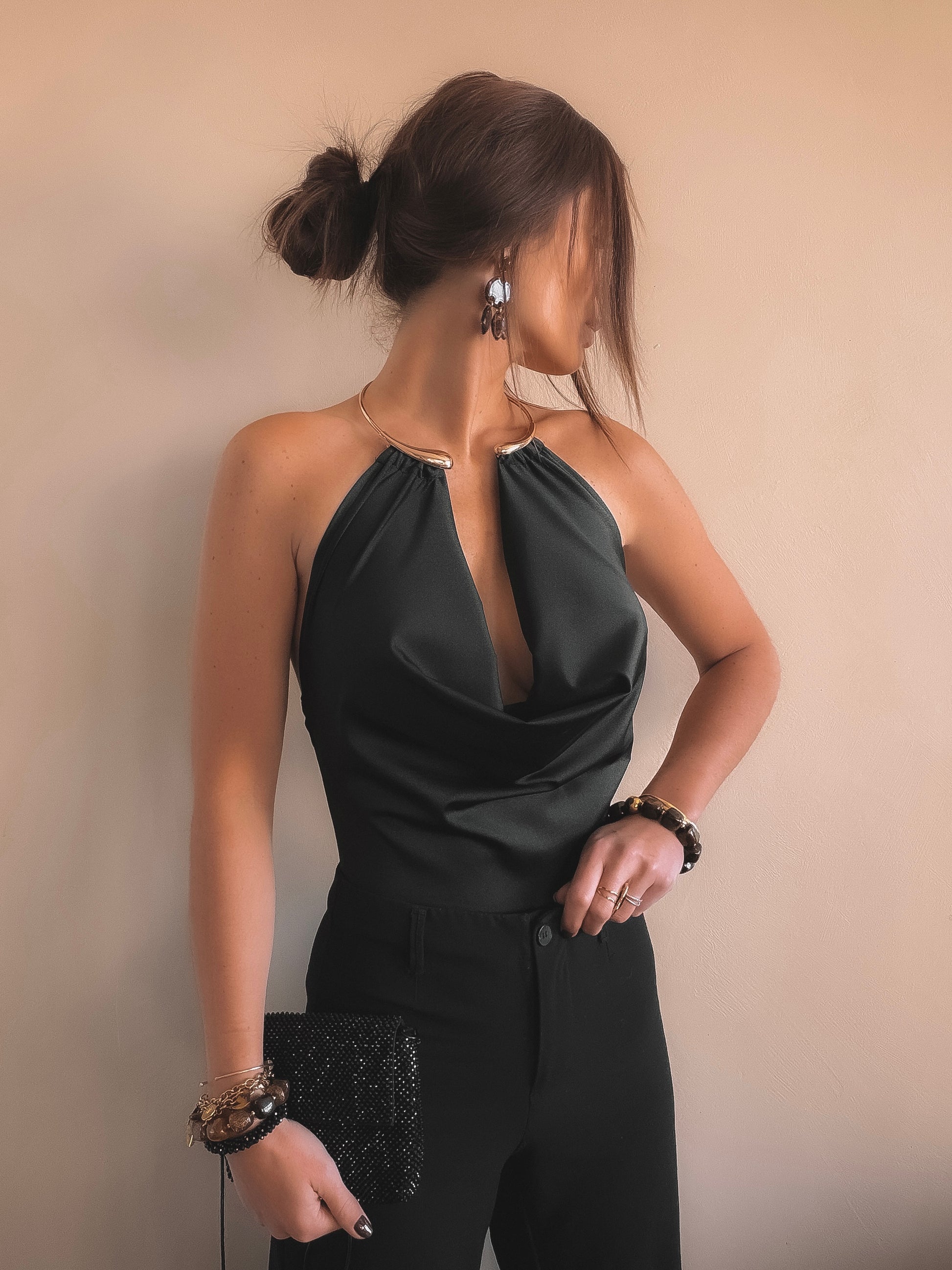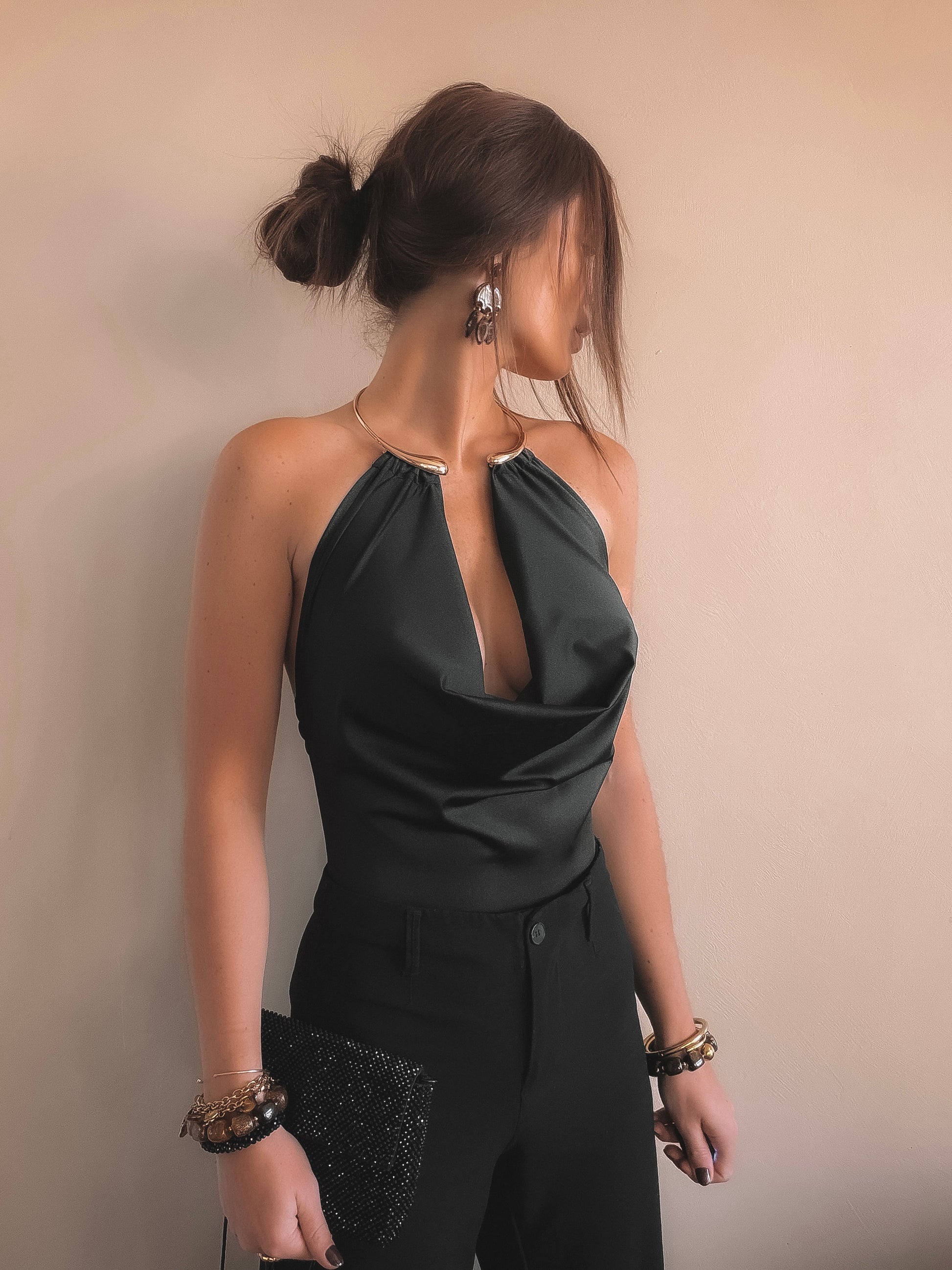• Décolleté drapé ultra élégant associé à son détail doré au niveau du cou qui en font la pièce parfaite pour briller en soirée. Fluide, chic et terriblement flatteur.