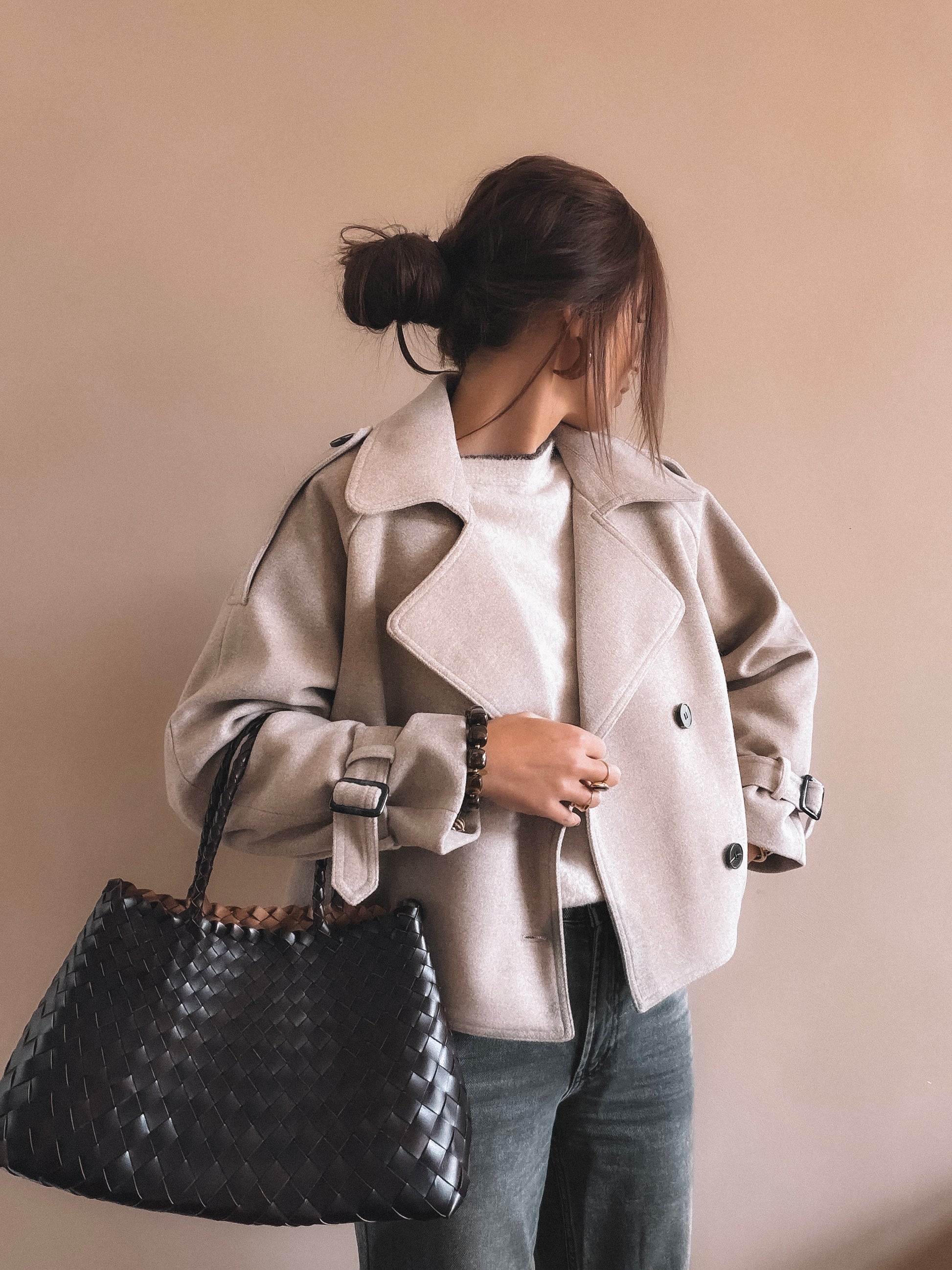 • Couleur beige, coupe oversize courte, détails à boucles au niveau des poignés et des manches